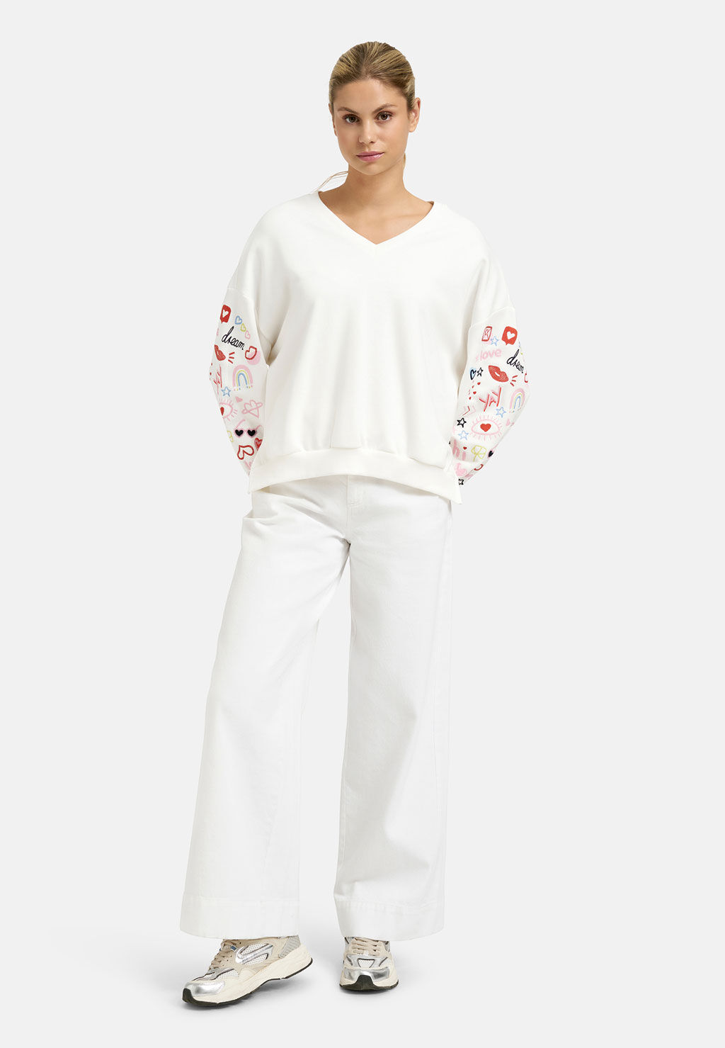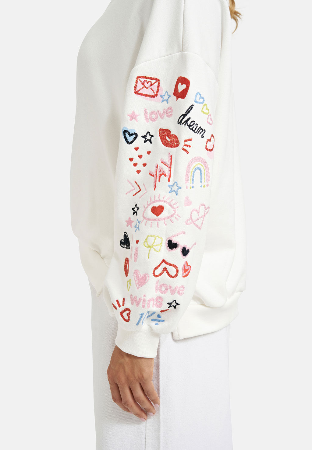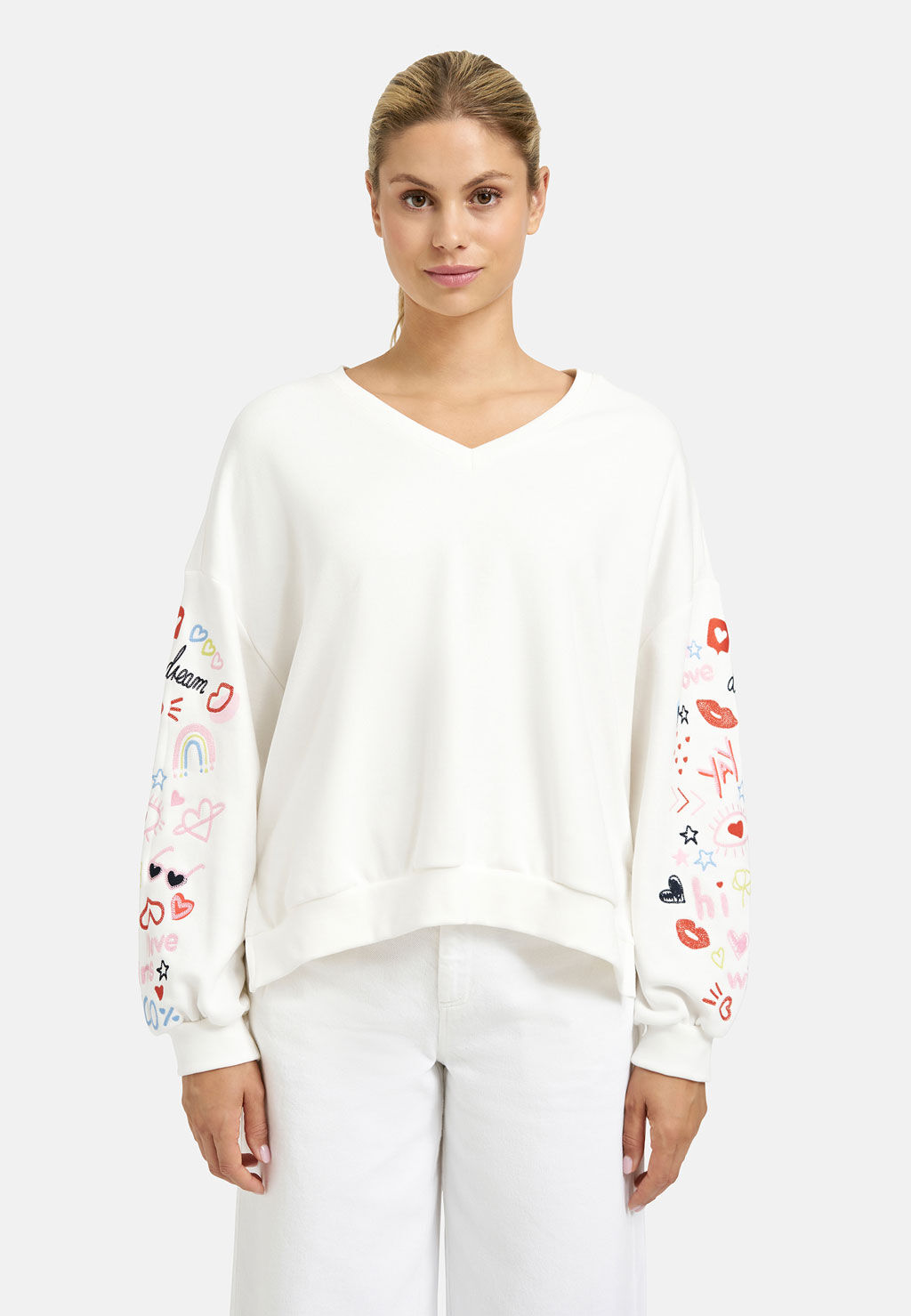 Dieser lässige Sweater von Smith & Soul bringt verspielte Akzente in deinen Alltag. Das weiß sorgt für einen soften Look, während die bunten Stickereien an den Ärmeln dem Design eine kreative, moderne Note verleihen. Der lockere Schnitt und das angenehm weiche Material machen den Pullover zum perfekten Begleiter für entspannte Casual-Outfits mit modischem Anspruch.