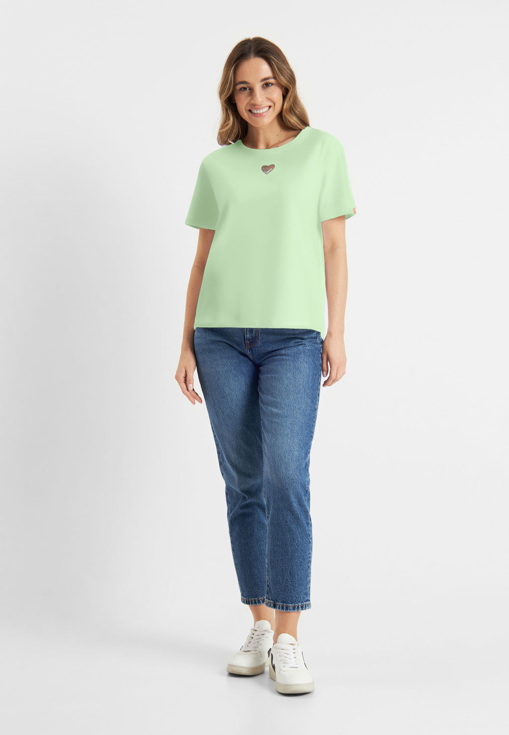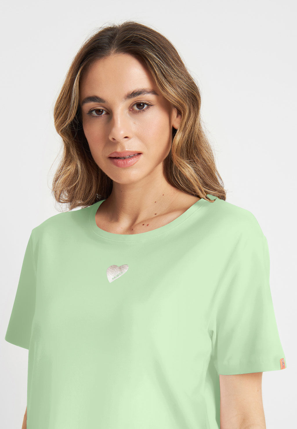 Dieses T-Shirt von Frieda & Freddies bringt frische Leichtigkeit in deine Garderobe. In zartem Grün gehalten und mit einem kleinen silberfarbenen Herz auf der Brust verziert, vereint es schlichte Eleganz mit einem liebevollen Detail. Der angenehme Stoff und die bequeme Passform machen es zum idealen Begleiter für entspannte Casual-Looks - ob zur Jeans, Shorts oder zum Rock. Ein vielseitiges Basic mit besonderem Charme, das jedem Outfit eine feminine Note verleiht.