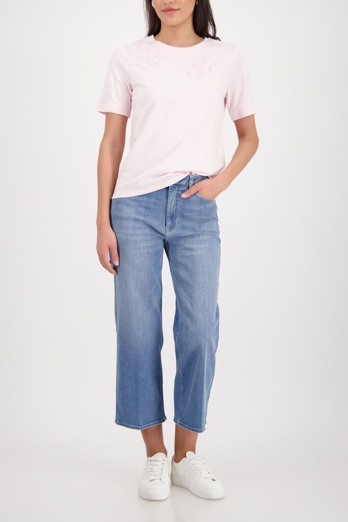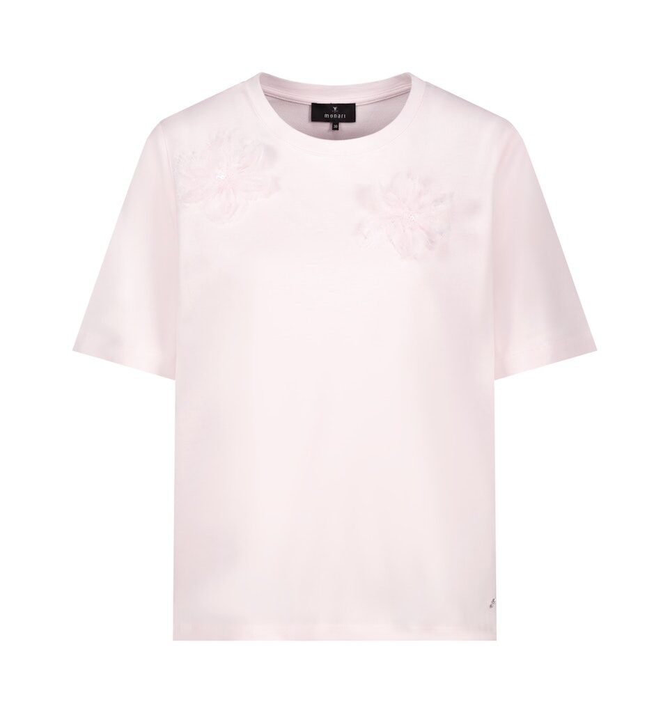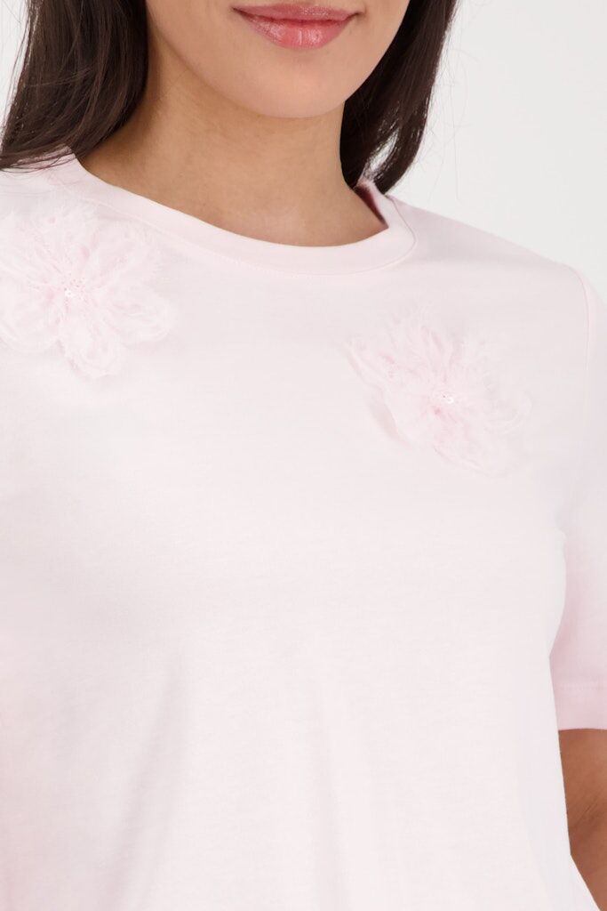 Elegantes T-Shirt mit 3D-Blumen, aus hochwertiger Baumwolle mit Modal, mit Frottee-Innenseite, Rundhalsausschnitt und kurzen Ärmeln.