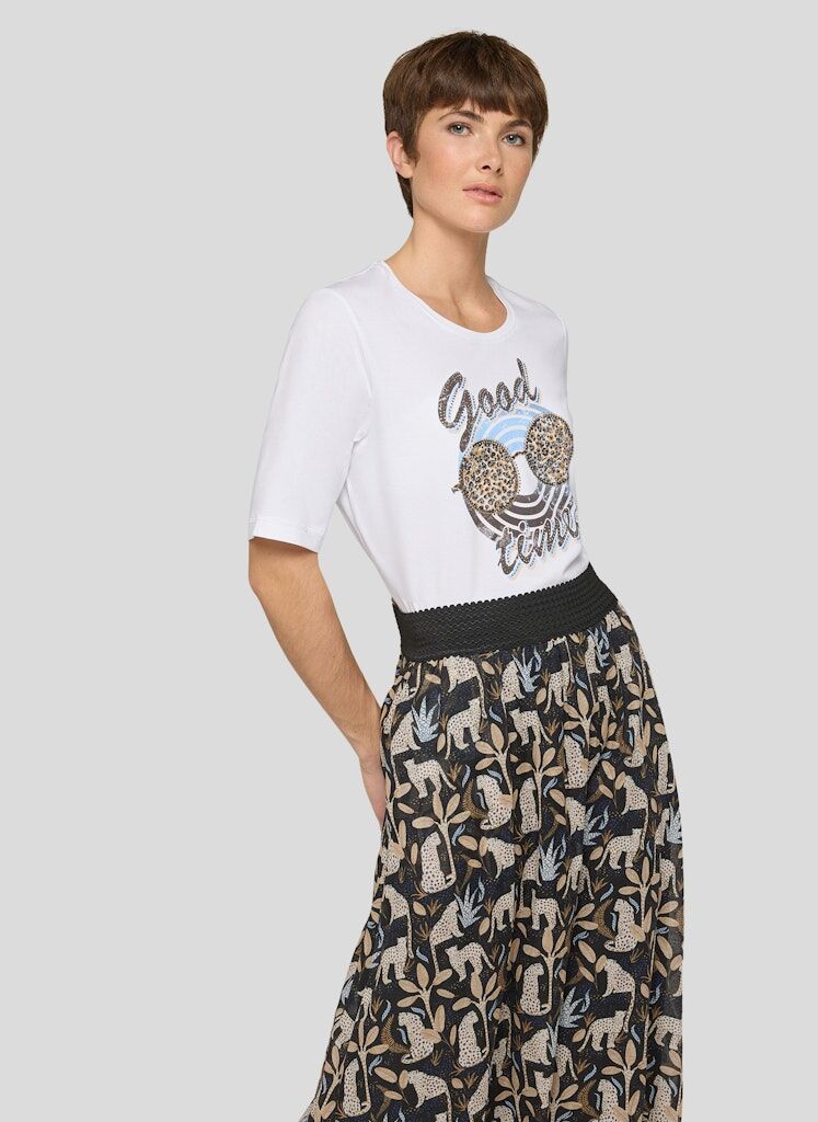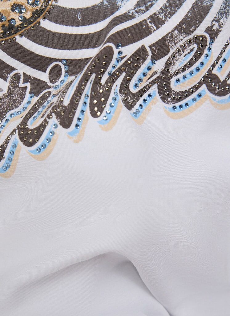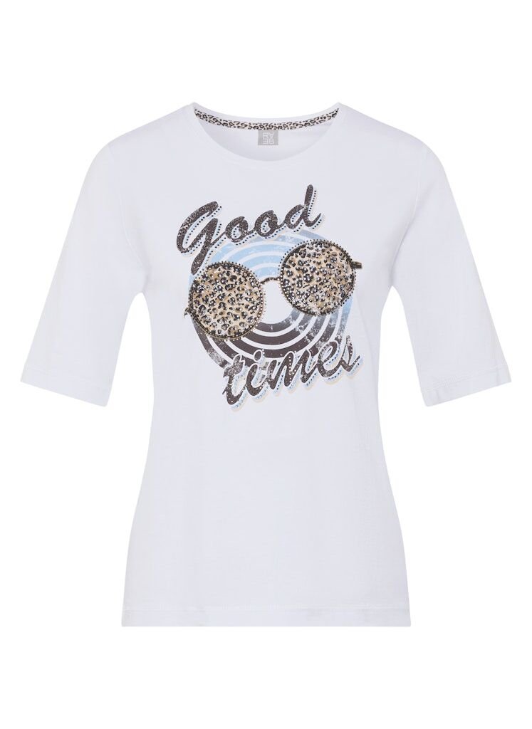 Dieses T-Shirt aus weicher Baumwolle mit Elasthananteil liegt angenehm auf der Haut und bietet durch seine elastische Qualität hohen Tragekomfort. Der klassische Rundhalsausschnitt und die halblangen Ärmel sorgen für eine zeitlose Passform. Blickfang ist das dekorative Frontmotiv mit Schriftzug und Sonnenbrille, das durch zahlreiche Strasssteine funkelnde Akzente erhält und dem Modell eine besondere Ausstrahlung verleiht. Ideal für gepflegte Freizeit-Looks mit modischem Twist. Baumwolle mit Elasthananteil. Weiche, elastische Qualität. Rundhalsausschnitt. Funkelndes Strassmotiv vorne. Angenehm zu tragen.