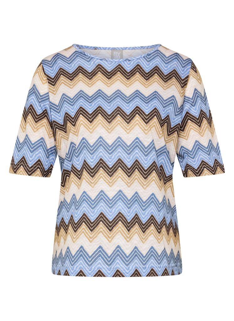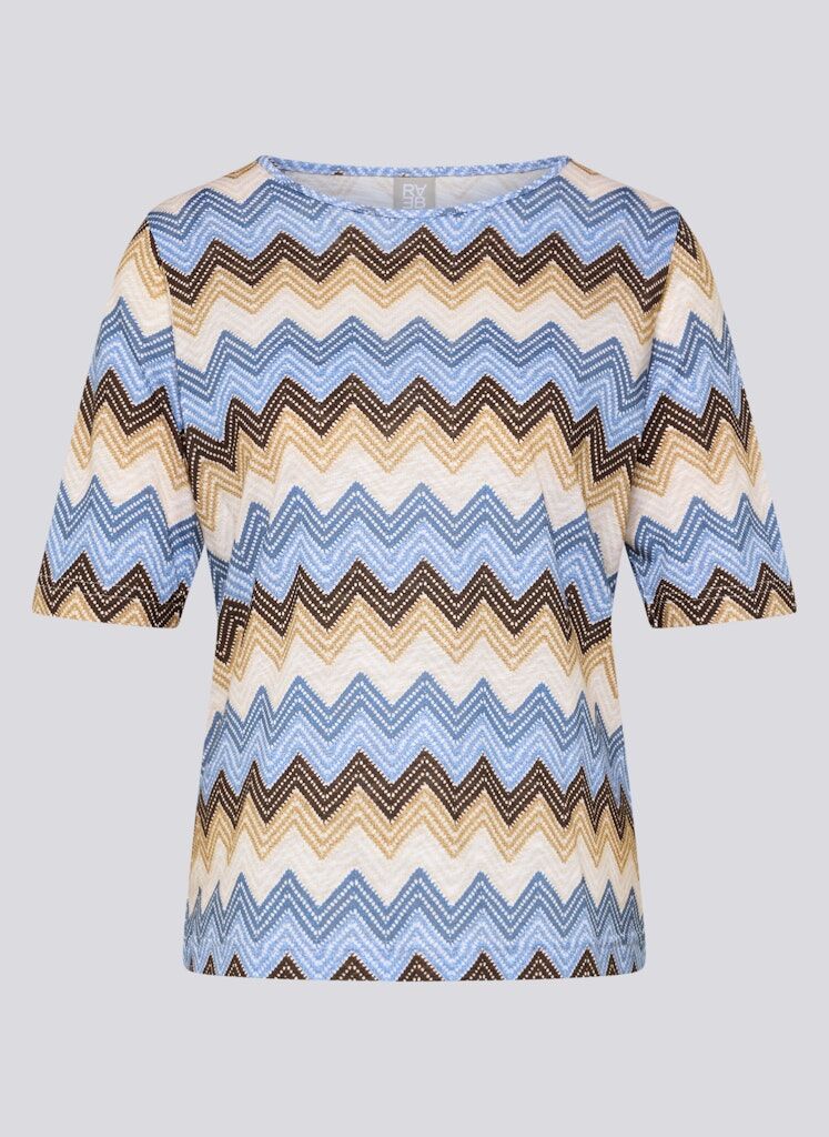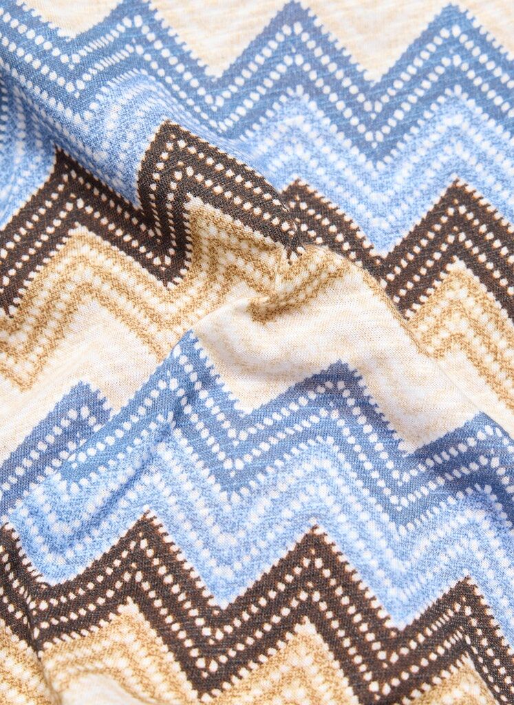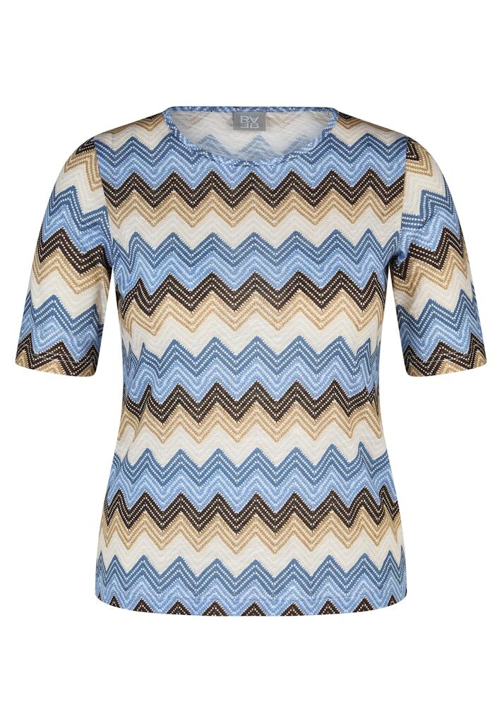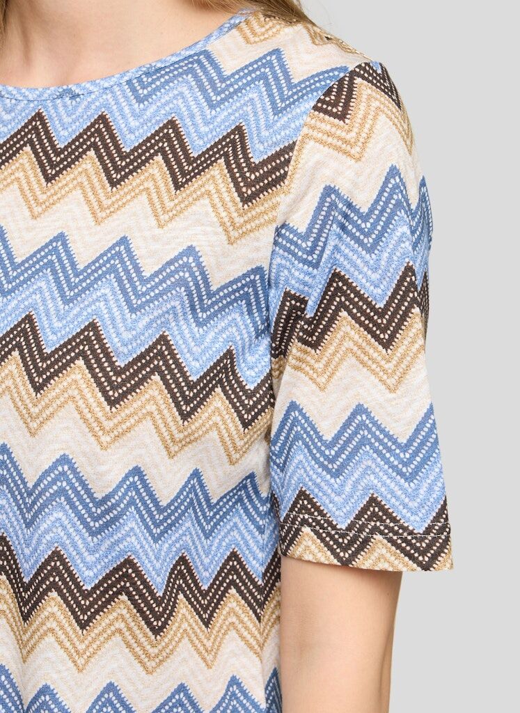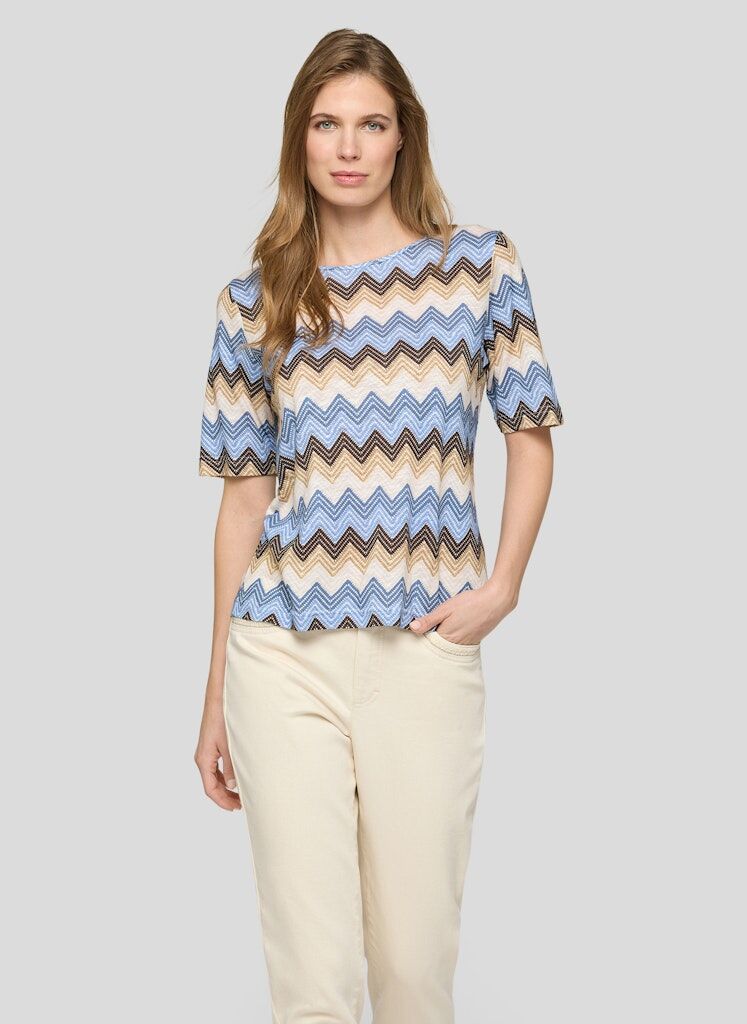 Angenehm weich und leicht zu tragen zeigt sich dieses Shirt aus einer komfortablen Baumwoll-Viskose-Mischung. Das Material verbindet hautfreundliche Eigenschaften mit einer fließenden Qualität und sorgt so für hohen Tragekomfort. Der klassische Rundhalsausschnitt und die halblangen Ärmel unterstreichen die zeitlose Form. Das ausdrucksstarke Zickzackdessin verleiht dem Modell eine dynamische Optik und macht es zu einem vielseitigen Begleiter für moderne Casual-Looks. Baumwolle-Viskose-Mischung. Weiche, fließende Qualität. Rundhalsausschnitt. Halblange Ärmel. Grafisches Zickzackdessin.