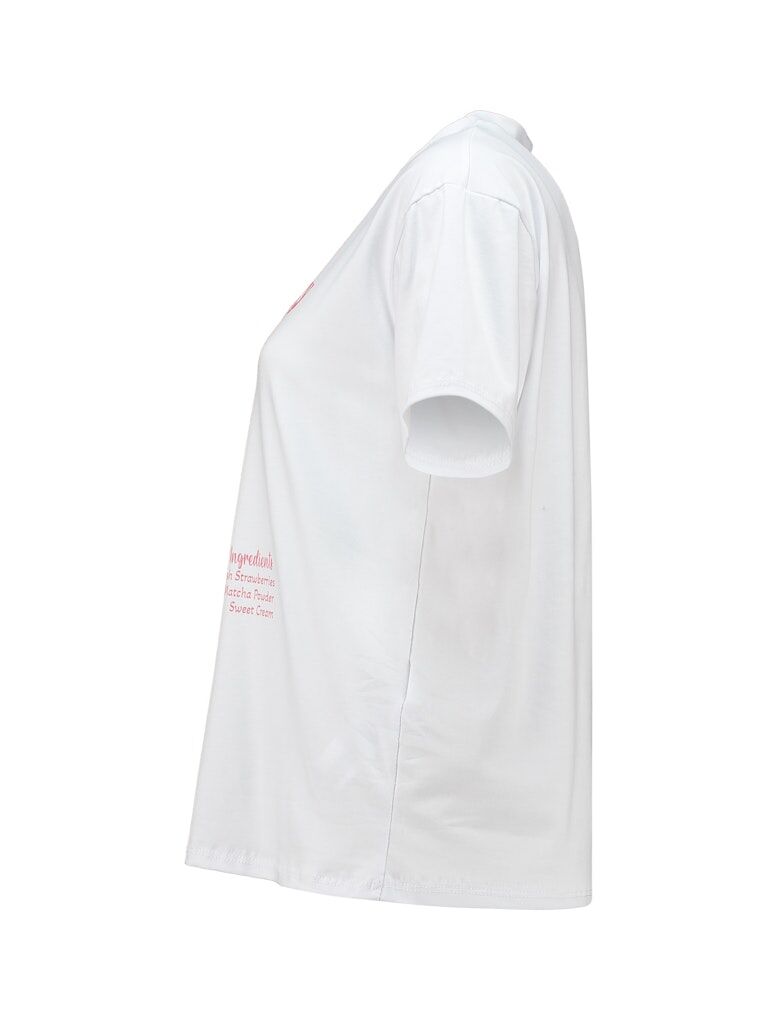 T-Shirt mit Strawberry Matcha Aufdruck, sowie leicht überschnittene Schultern, und einem Rundhalsausschnitt