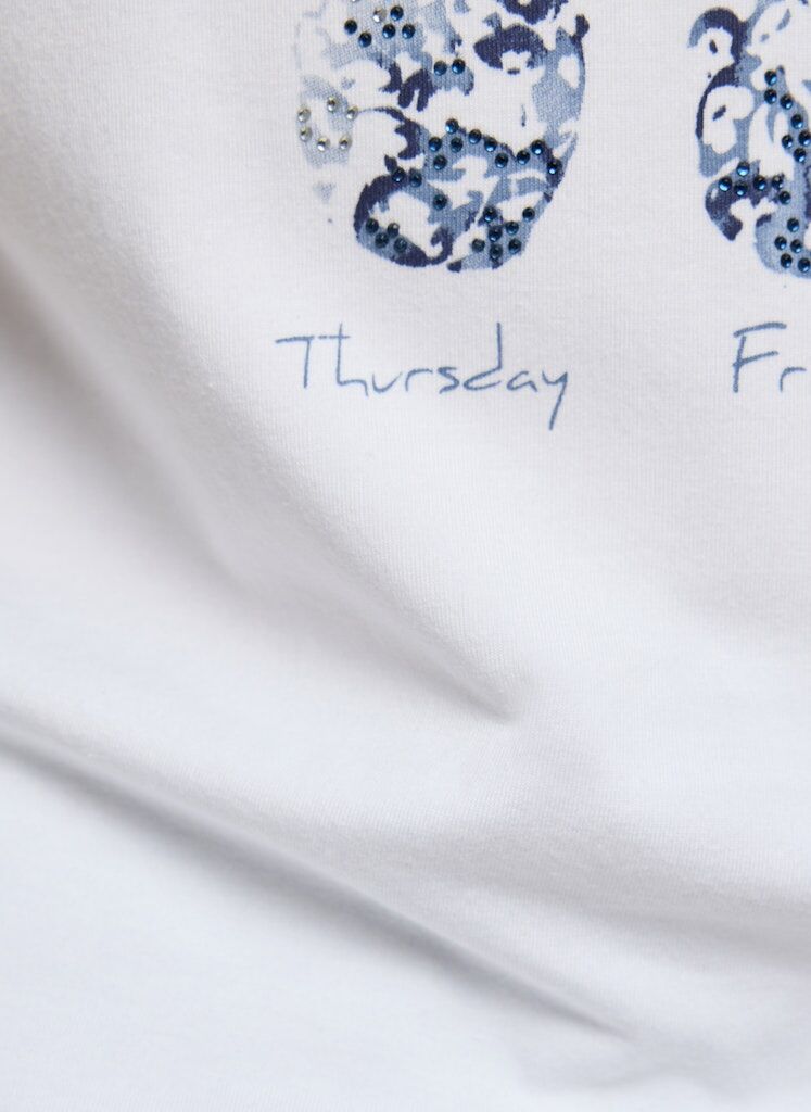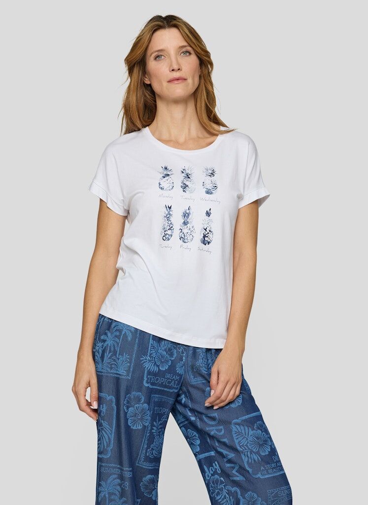 Das dekorative Ananas-Motiv mit funkelnden Details setzt einen frischen, sommerlichen Akzent. Die gerade, bequeme Form lässt sich vielseitig kombinieren und wirkt angenehm unkompliziert. Ein klassischer Rundhalsausschnitt und kurze Ärmel unterstreichen den lässigen Charakter. Der weiche Baumwoll-Modal-Mix fühlt sich besonders angenehm auf der Haut an. Baumwoll-Modal-Mix. Rundhalsausschnitt. Halbarm. Motiv mit Zierdetails. Gerade Passform.