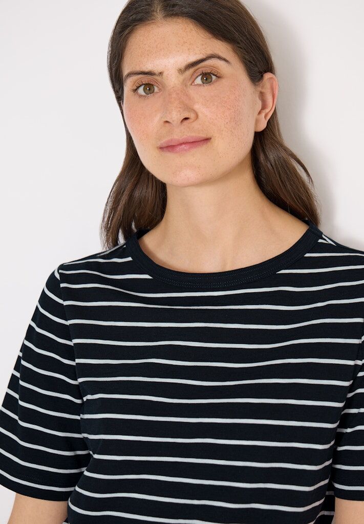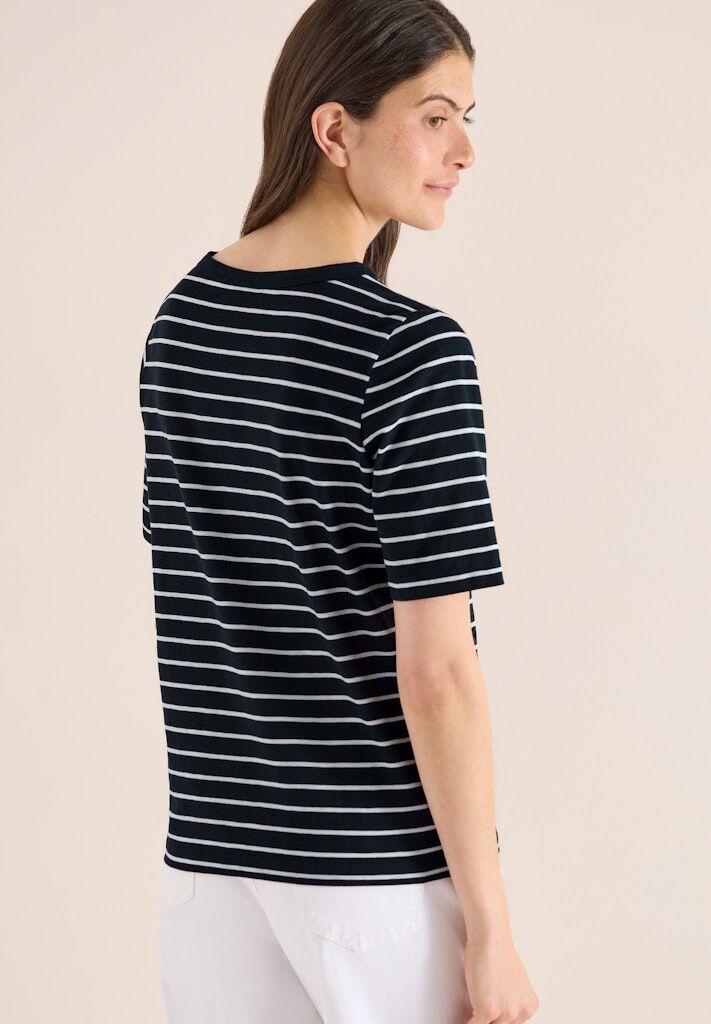 Das gestreifte T-Shirt von CECIL für Damen überzeugt mit klassischem Design und bequemer Qualität. Der U-Boot-Ausschnitt verleiht dem Look eine feminine Note. Reine Baumwolle sorgt für ein angenehmes Tragegefühl. Ein vielseitiger Begleiter für den Alltag. Baumwollshirt Casual U-Boot-Ausschnitt Kurzarm Schlicht und vielseitig Material: 100% Baumwolle