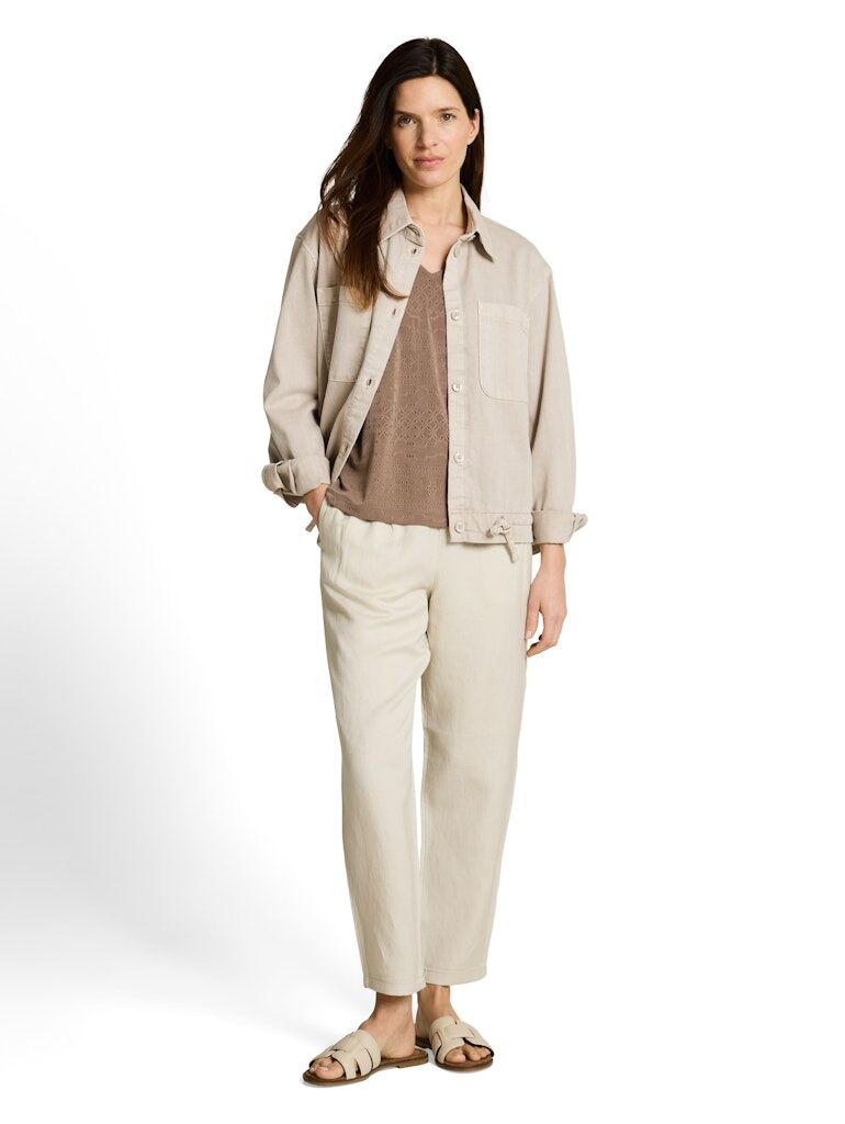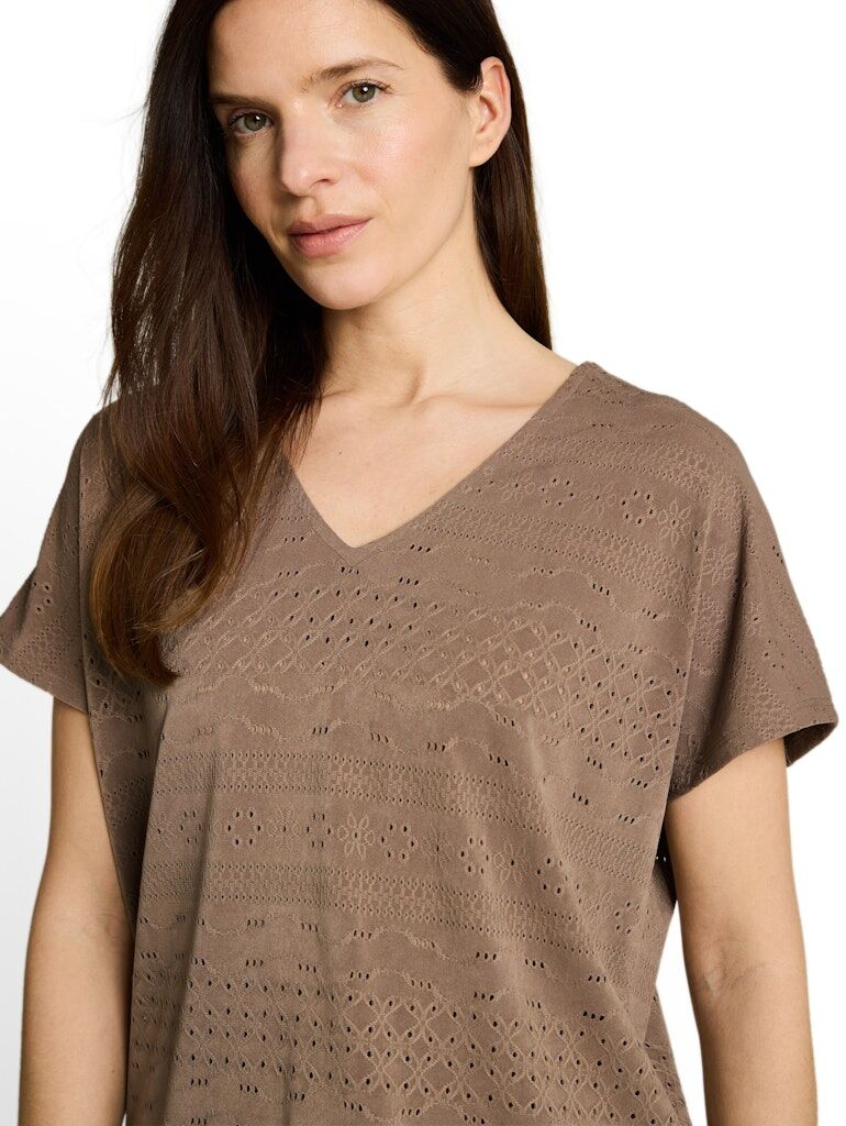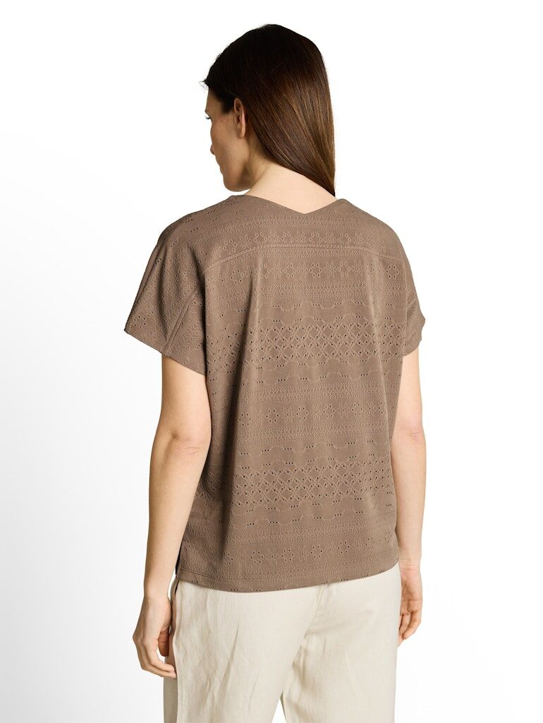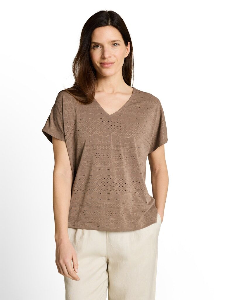 Locker geschnittenes T-Shirt mit Lochmuster. Mit V-Ausschnitt und kurzen Seitenschlitzen. Aus einem strukturierten Jacquard-Stoff.
