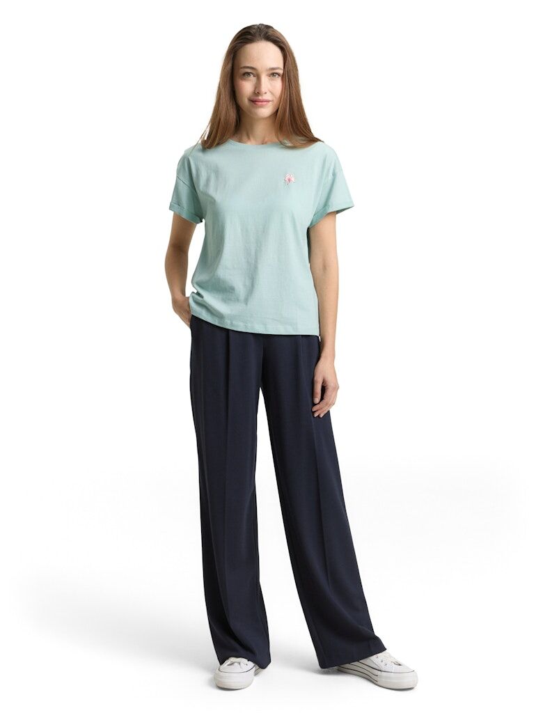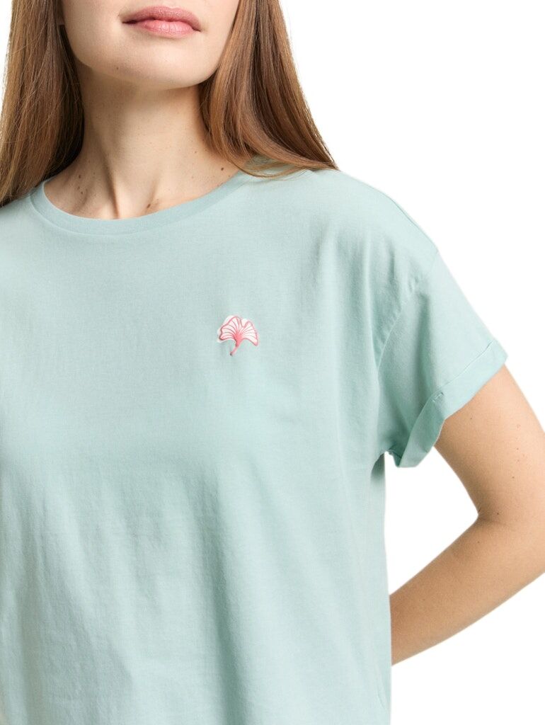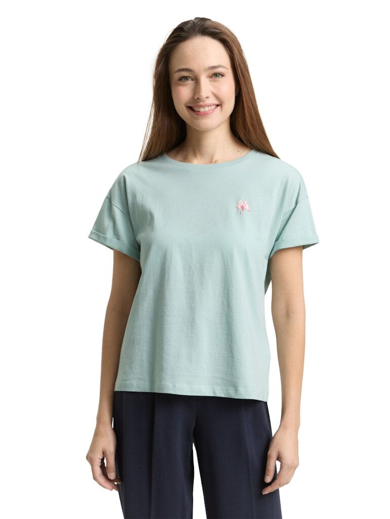 T-Shirt mit kleiner Stickerei auf der Brust und überschnittener Schulternaht. Aus einem Single-Jersey-Stoff aus Baumwolle.