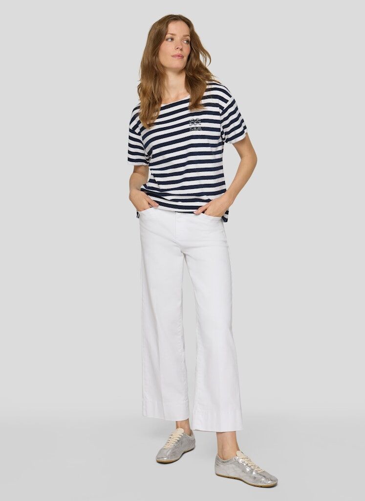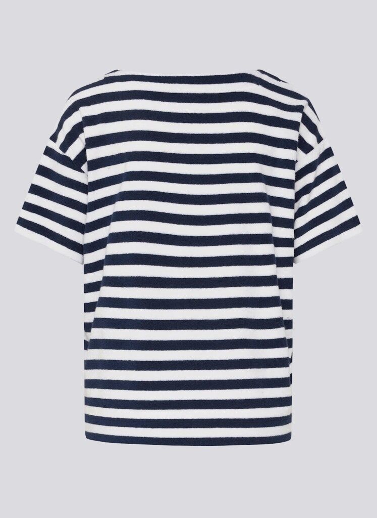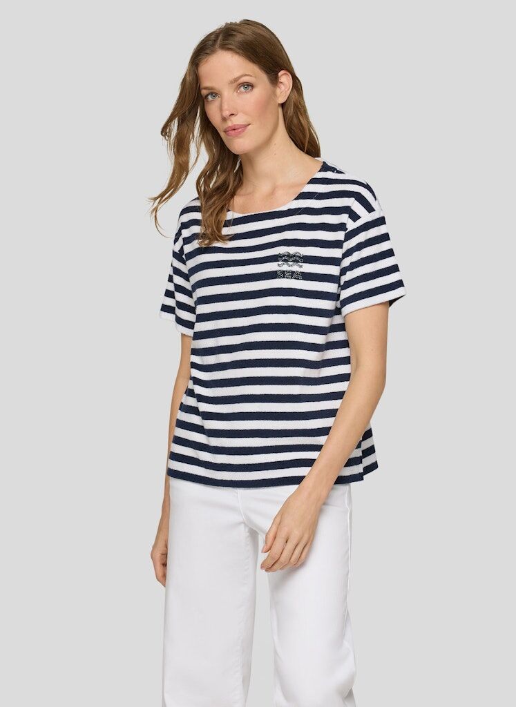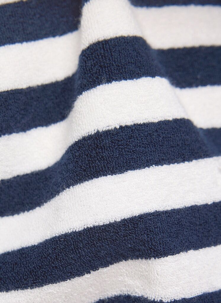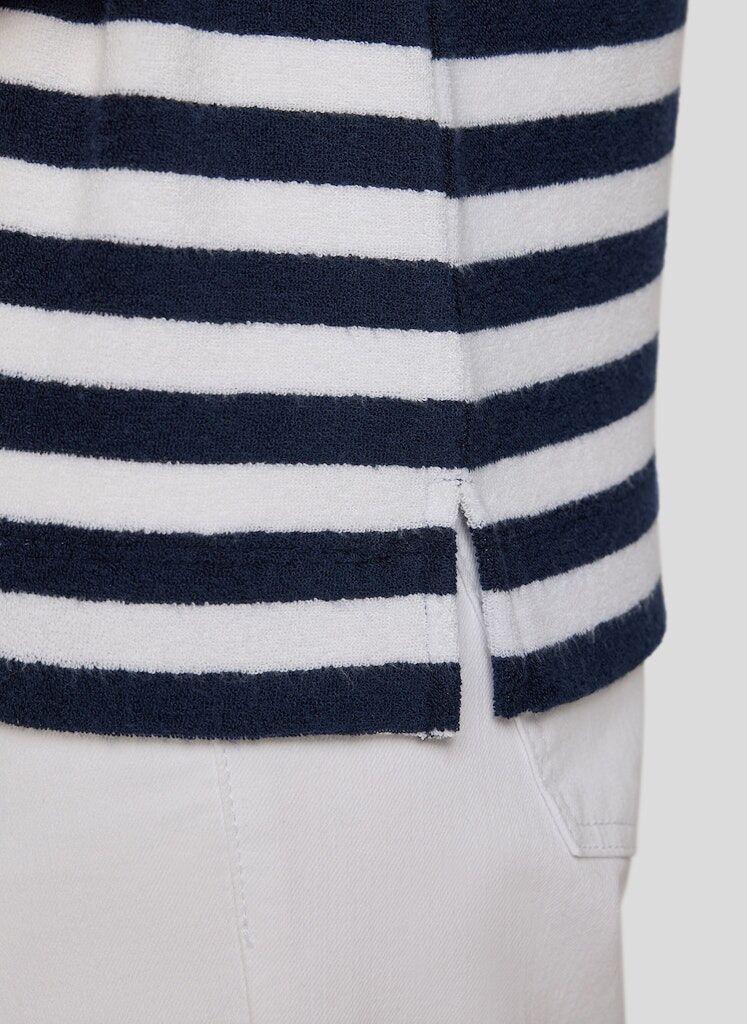 Die flauschige Frottierstruktur verleiht dem Streifenmuster eine besonders weiche, lebendige Optik. Ein kleines Strassmotiv auf der Brust setzt einen dezenten Glanzpunkt. Die locker fallende Form mit leicht überschnittenen Schultern wirkt entspannt und bequem. Seitliche Schlitze am Saum unterstützen die Bewegungsfreiheit und den lässigen Sitz. Weiche Frottierqualität. Maritimes Streifenmuster. Strassmotiv auf der Brust. U-Boot-Ausschnitt. Seitliche Saumschlitze.