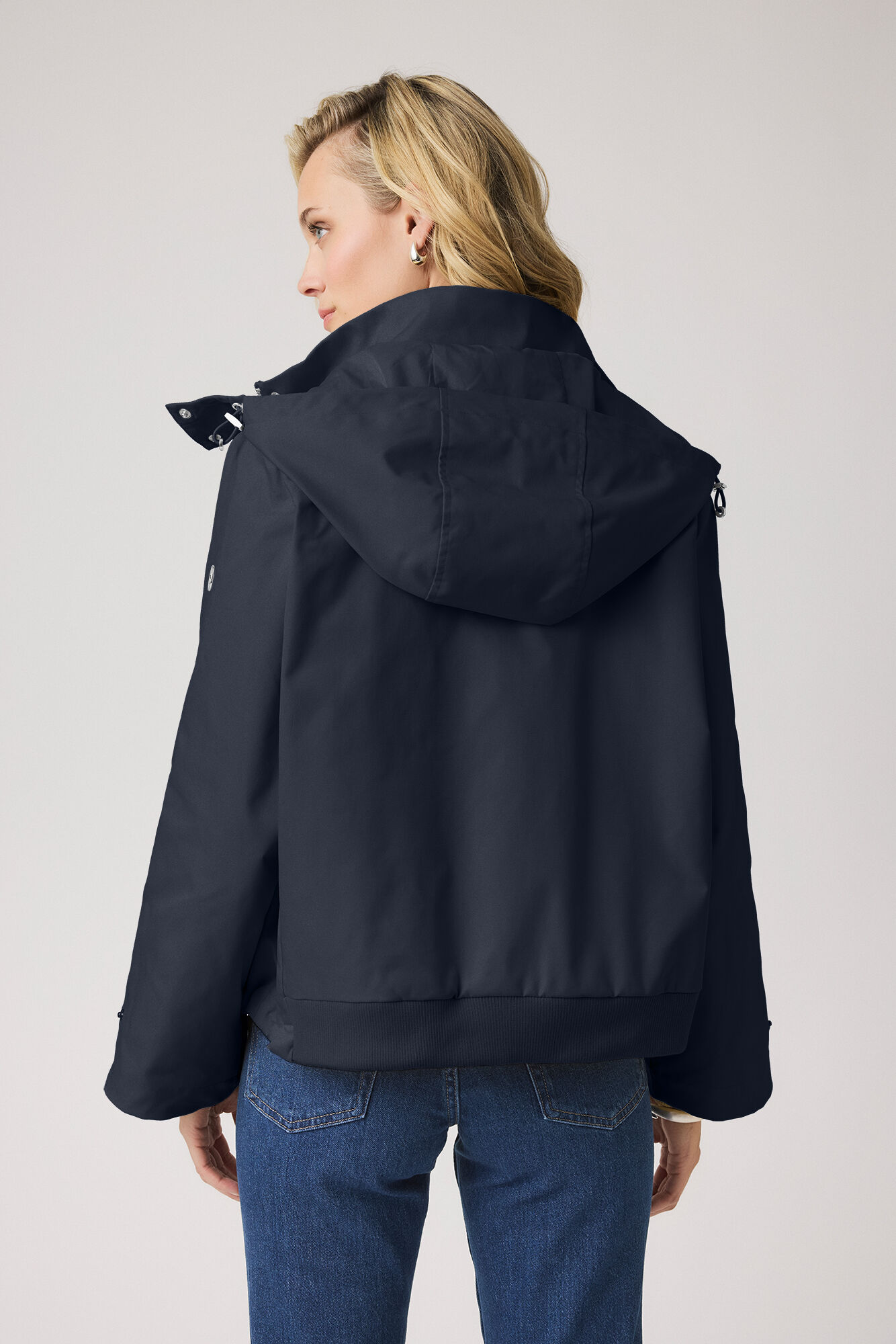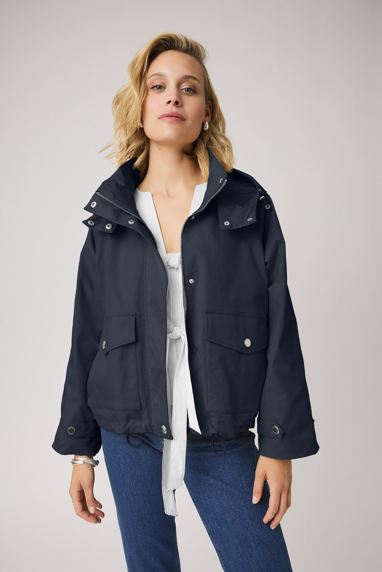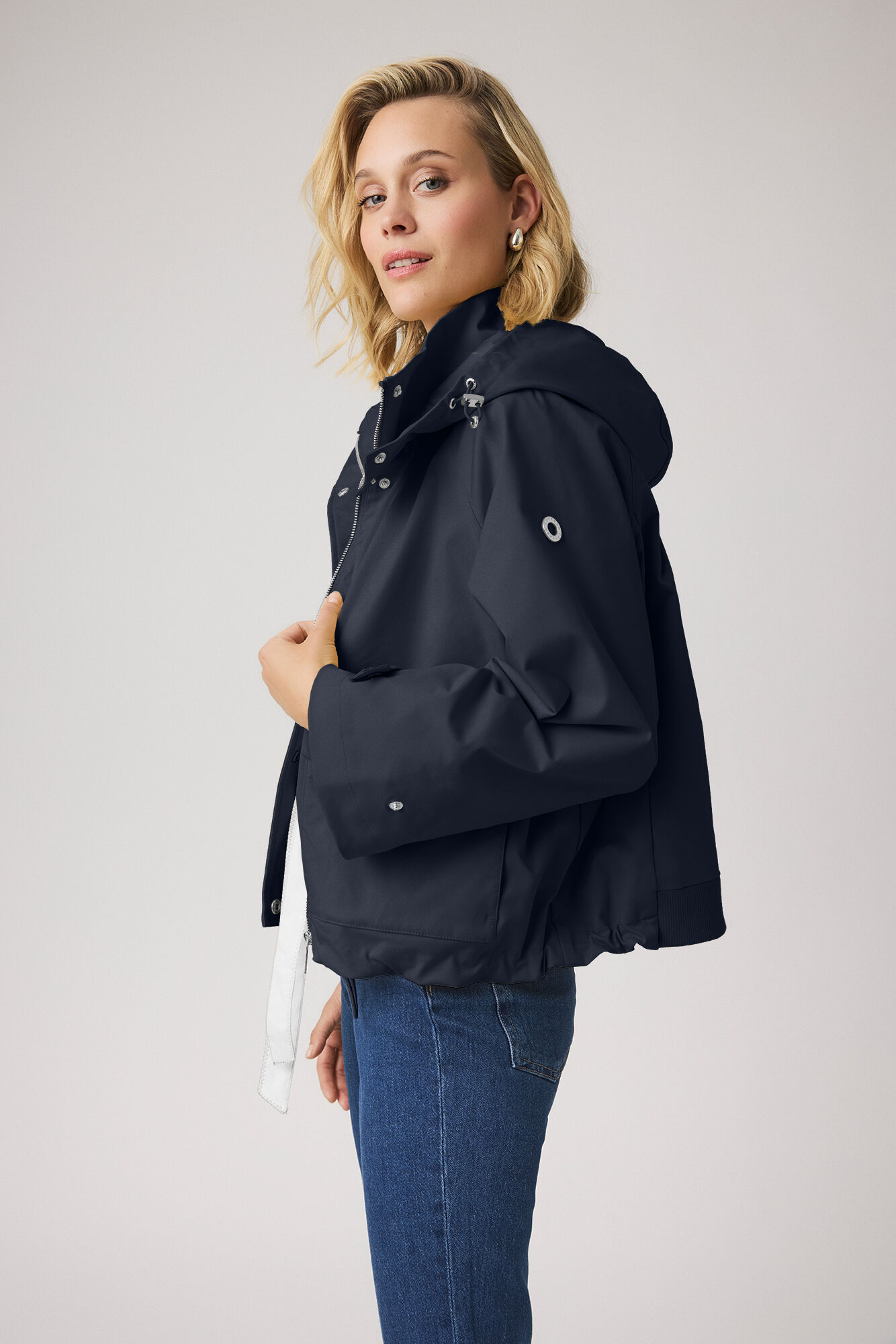 - Details: Verdeckter Reißverschluss mit Druckknopfleiste, hohe Kragenform, Kapuze mit Druckknöpfen, aufgesetzte Taschen mit Patte, Rippbündchen an den Ärmeln, verstellbarer Saum mit Kordelzug