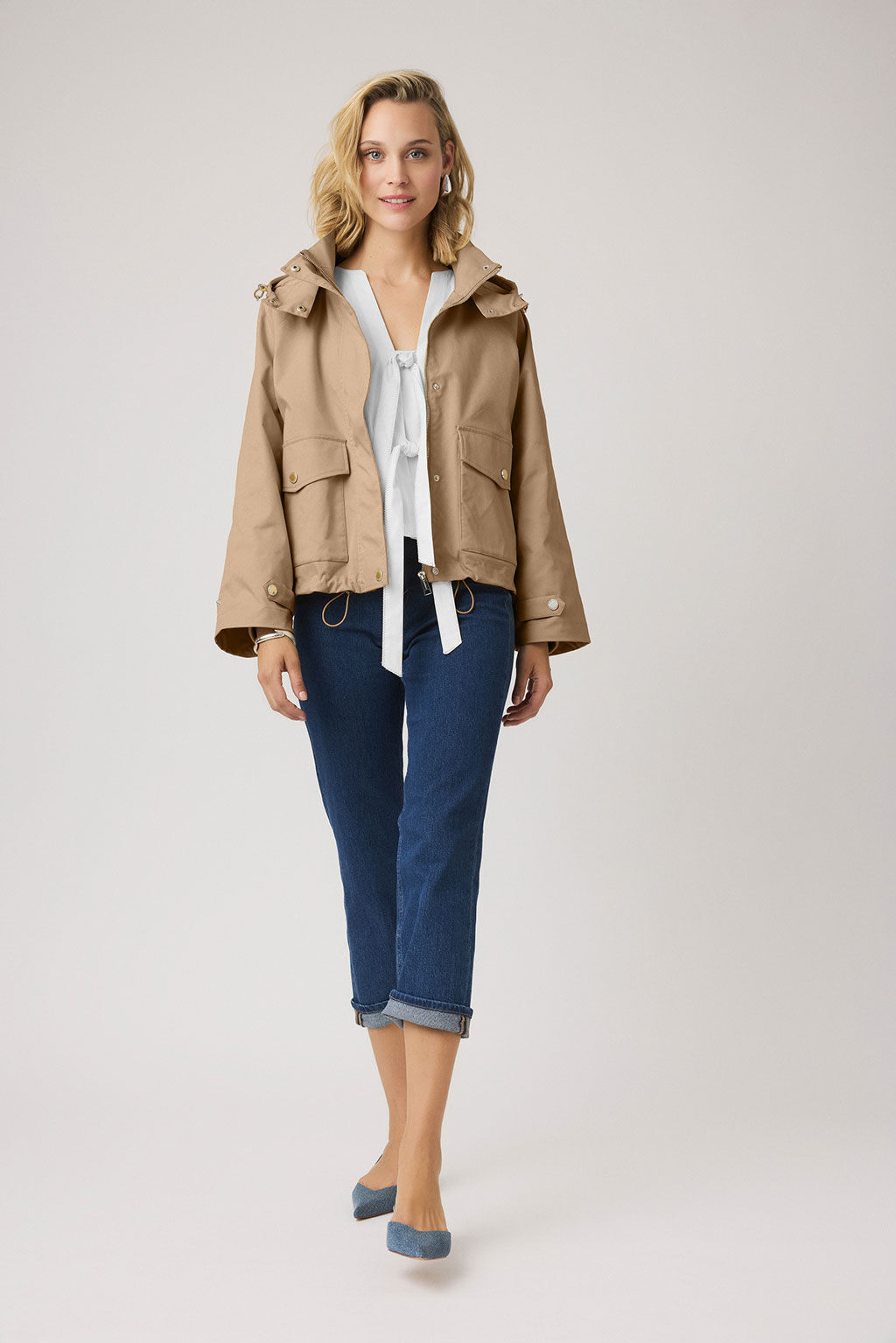- Details: Verdeckter Reißverschluss mit Druckknopfleiste, hohe Kragenform, Kapuze mit Druckknöpfen, aufgesetzte Taschen mit Patte, Rippbündchen an den Ärmeln, verstellbarer Saum mit Kordelzug
