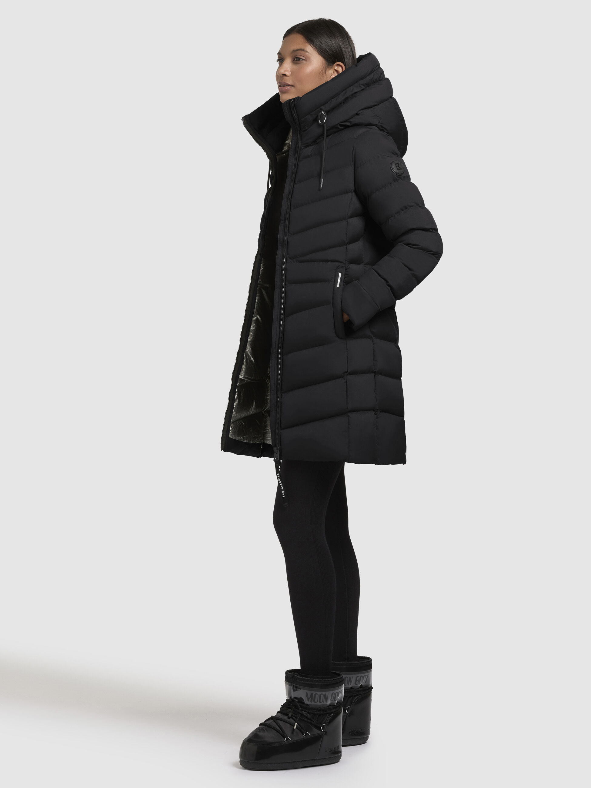 - hoch schließende Kapuze mit Kordelzug