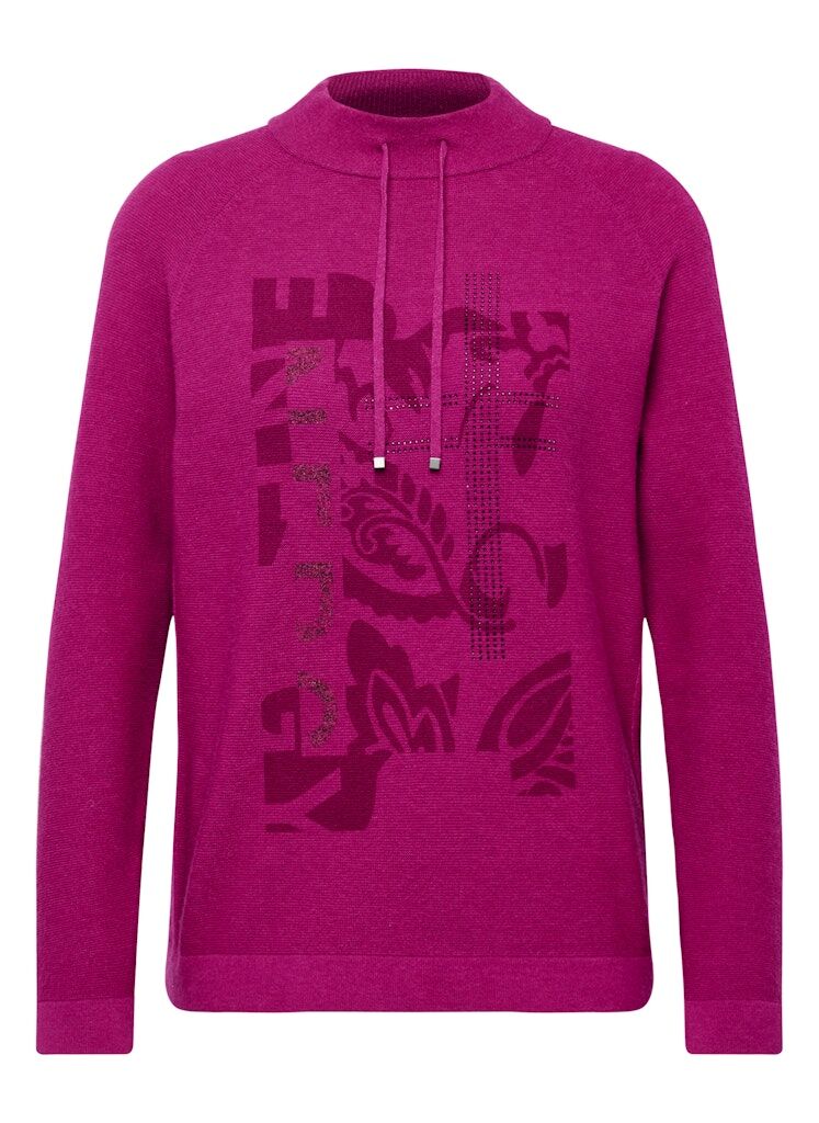 Der auffällige Frontprint in Kombination mit funkelnden Details sorgt für einen modernen Look. Der bequeme Stehkragen mit Kordelzug verleiht dem Pullover eine lässige, sportliche Note. Weiches Material bietet angenehmen Tragekomfort und hält an kühlen Tagen warm. Ideal für entspannte Freizeitlooks.
