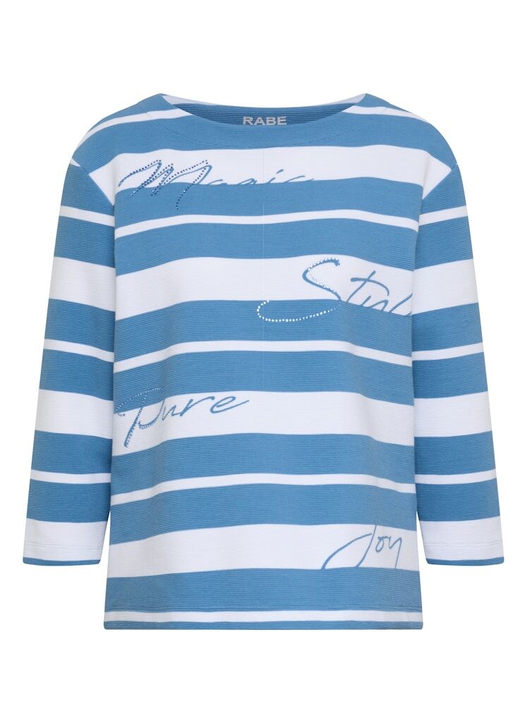 Dieses Shirt verbindet klassische Streifenoptik mit modischen Schriftzügen, die dem Design eine frische und trendige Ausstrahlung verleihen. Dezente Glitzersteine setzen funkelnde Akzente und sorgen für ein besonderes Highlight. Der Rundhalsausschnitt und die ¾-Ärmel machen das Shirt zu einem vielseitigen Begleiter für unterschiedlichste Gelegenheiten.Elastische Qualität für angenehmen Tragekomfort.Gerade, leicht figurumspielende Passform.Pflegeleichtes Material.Ideal kombinierbar zu Jeans, Stoffhosen oder Röcken für lässige oder sportliche Looks.