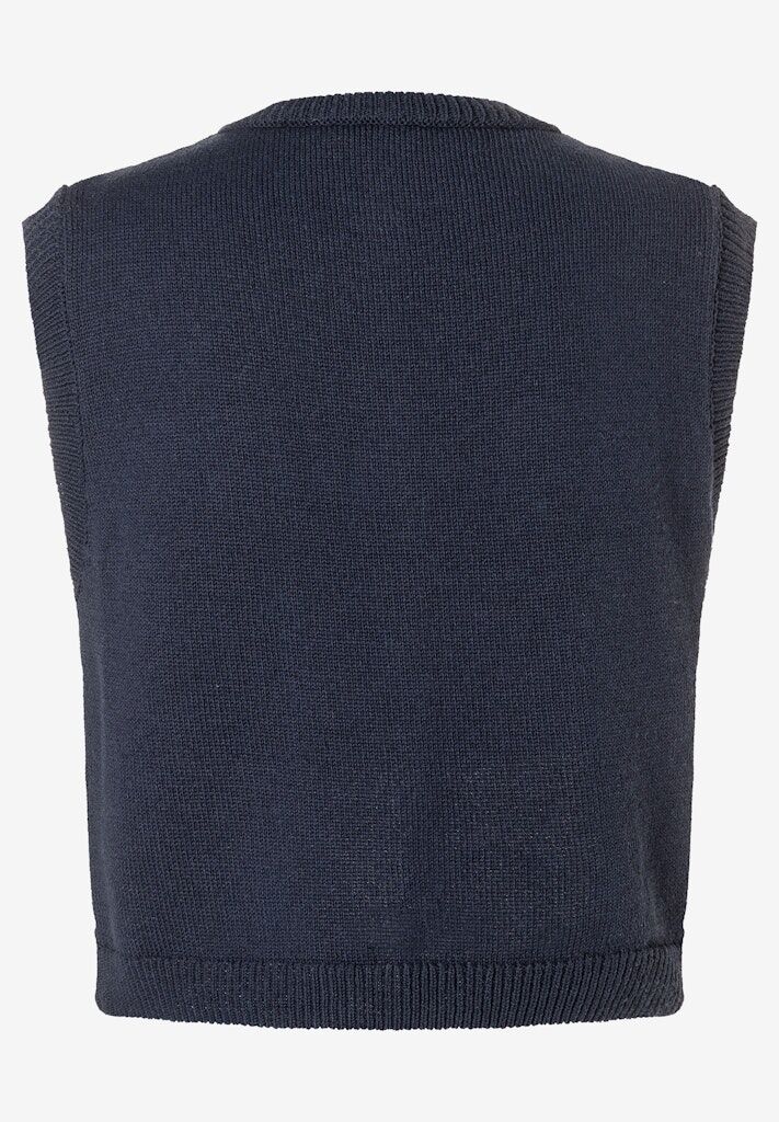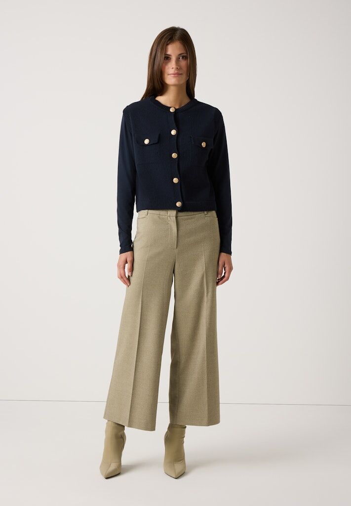 Die kurze Strickweste von MORE & MORE mit goldfarbenen Metallknöpfen und aufgesetzten Brusttaschen kann perfekt über Blusen getragen werden, sieht aber genauso gut zum fließenden Printkleid aus - ein vielseitiger Kombipartner mit modischem Twist.